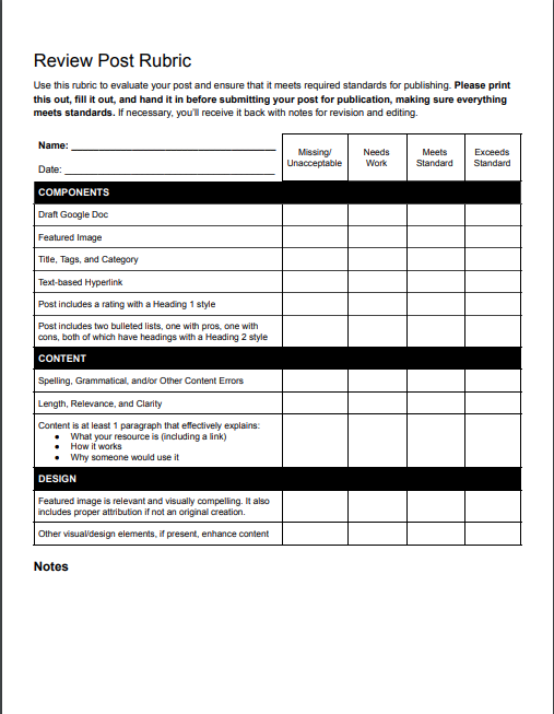 Use this rubric to ensure that your work meets standards. Please be sure to print it, fill it out, and hand it in before submitting your blog post for review.