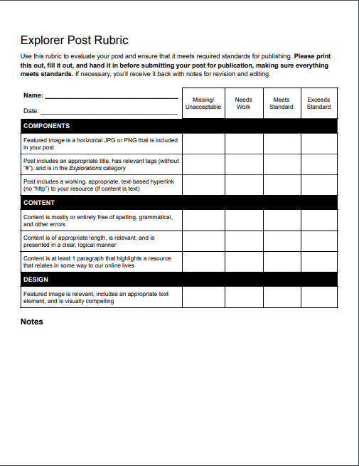 Please use this rubric to make sure you meet all standards for publication of your Explorer post.