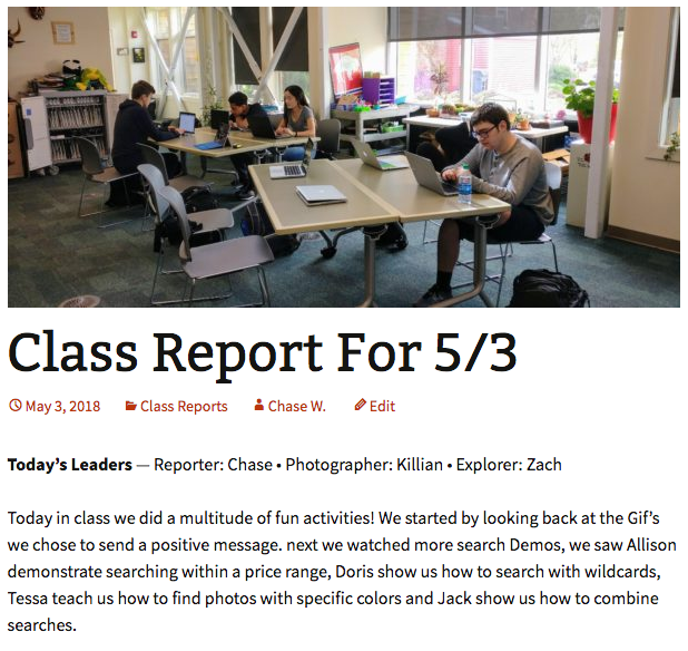 The Class Reporter is responsible for writing down what happens during class, including the topics we cover and the things we discuss. Then, the reporter takes this information and uses it to create a new post on our class blog.
