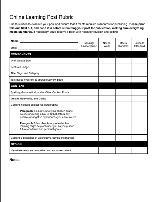 Use this rubric to ensure that your work meets standards. Please be sure to print it, fill it out, and hand it in before submitting your blog post for review.