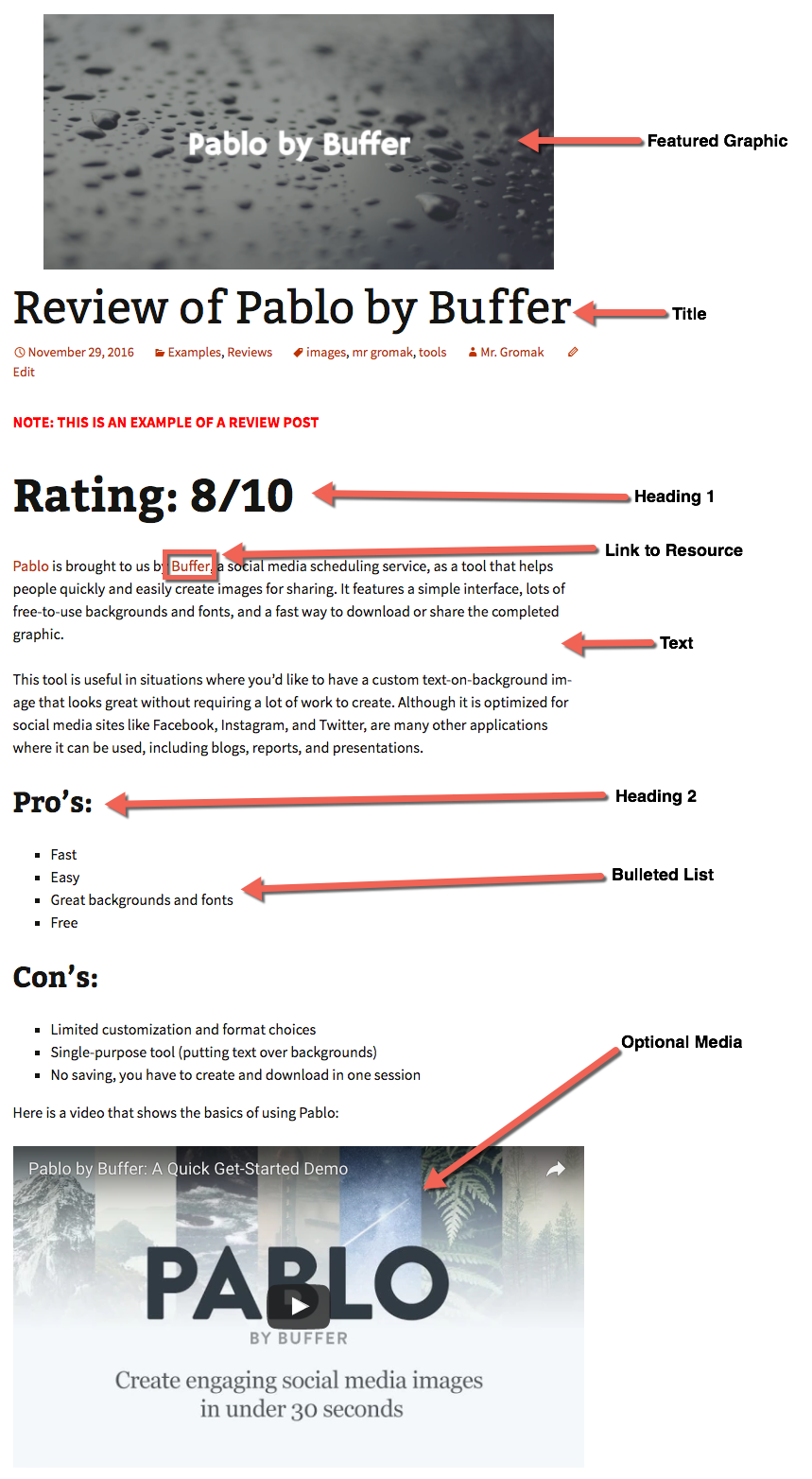 - Create and submit your post for teacher review (including title, content, tags, the “Review” category, featured image, etc.)